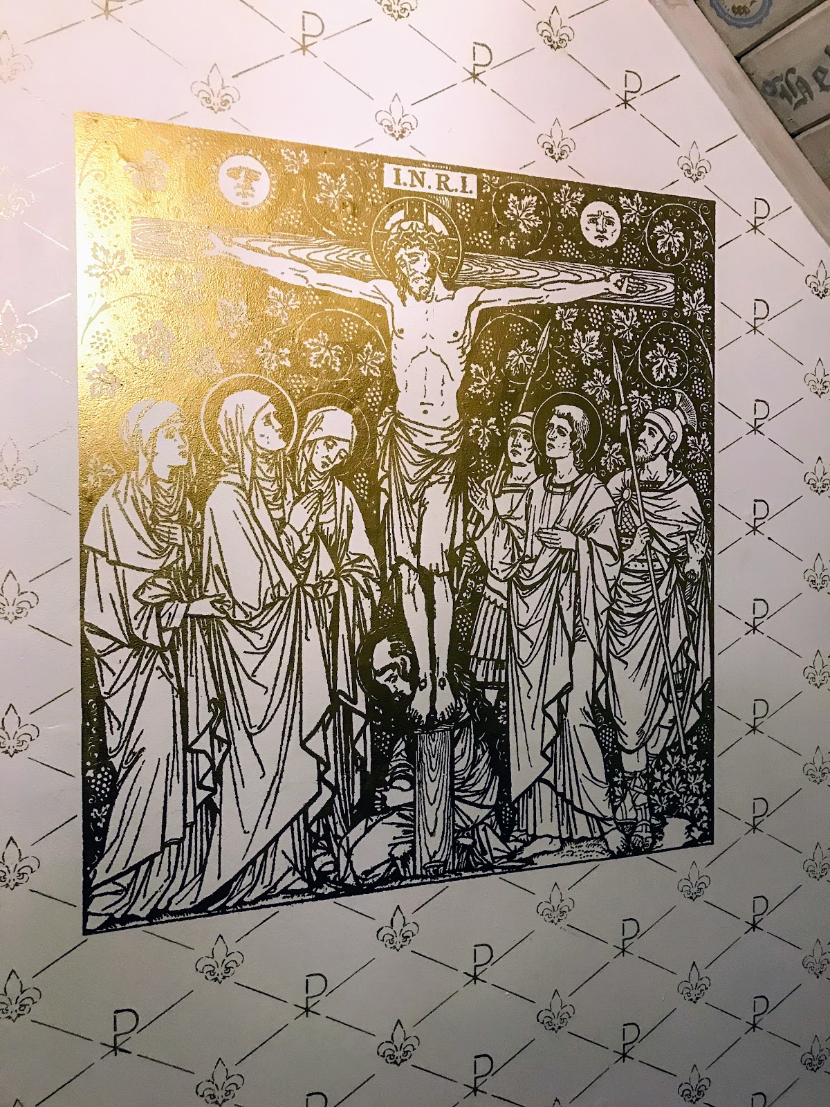 And then created a chi rho and fleur de lis pattern stencil (this one wasn’t adhesive) because the rest of the wall looked pretty bare all of a sudden.