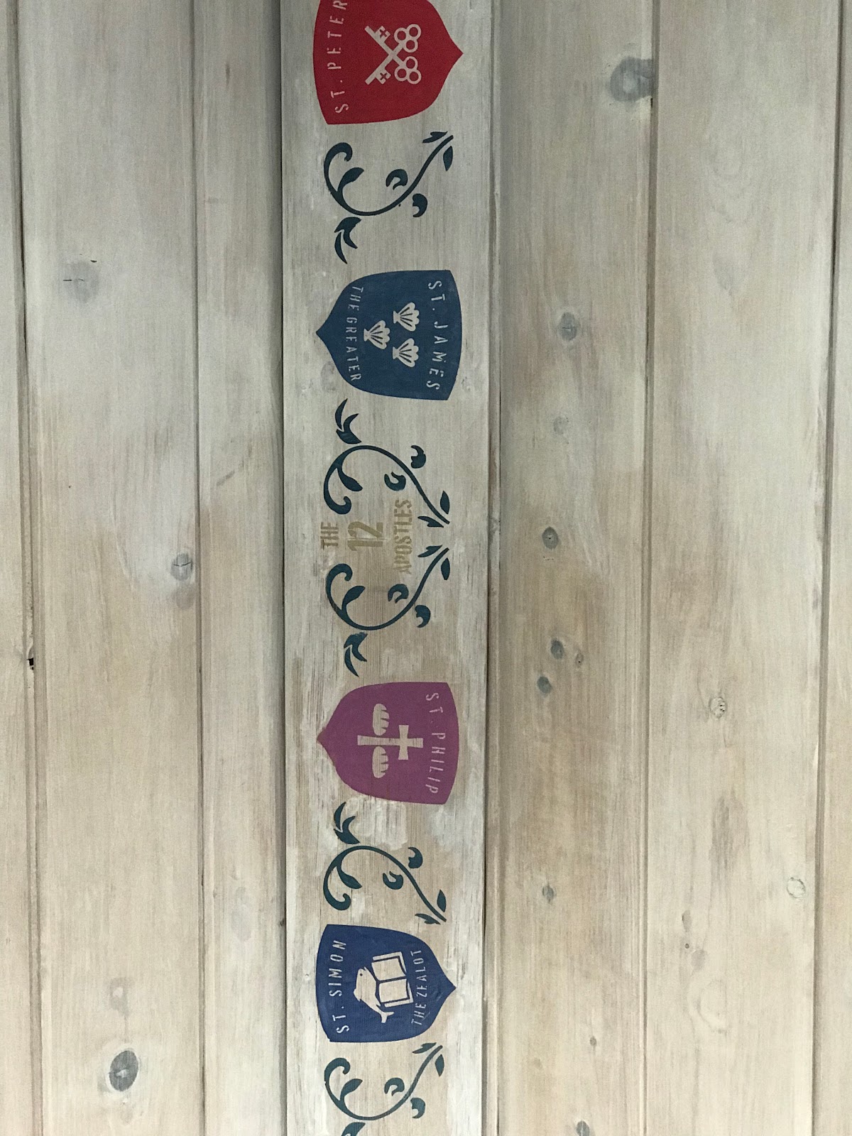 My first decorative painting project was the center beam of the ceiling, which I stenciled with the traditional shield symbols of the twelve apostles.
