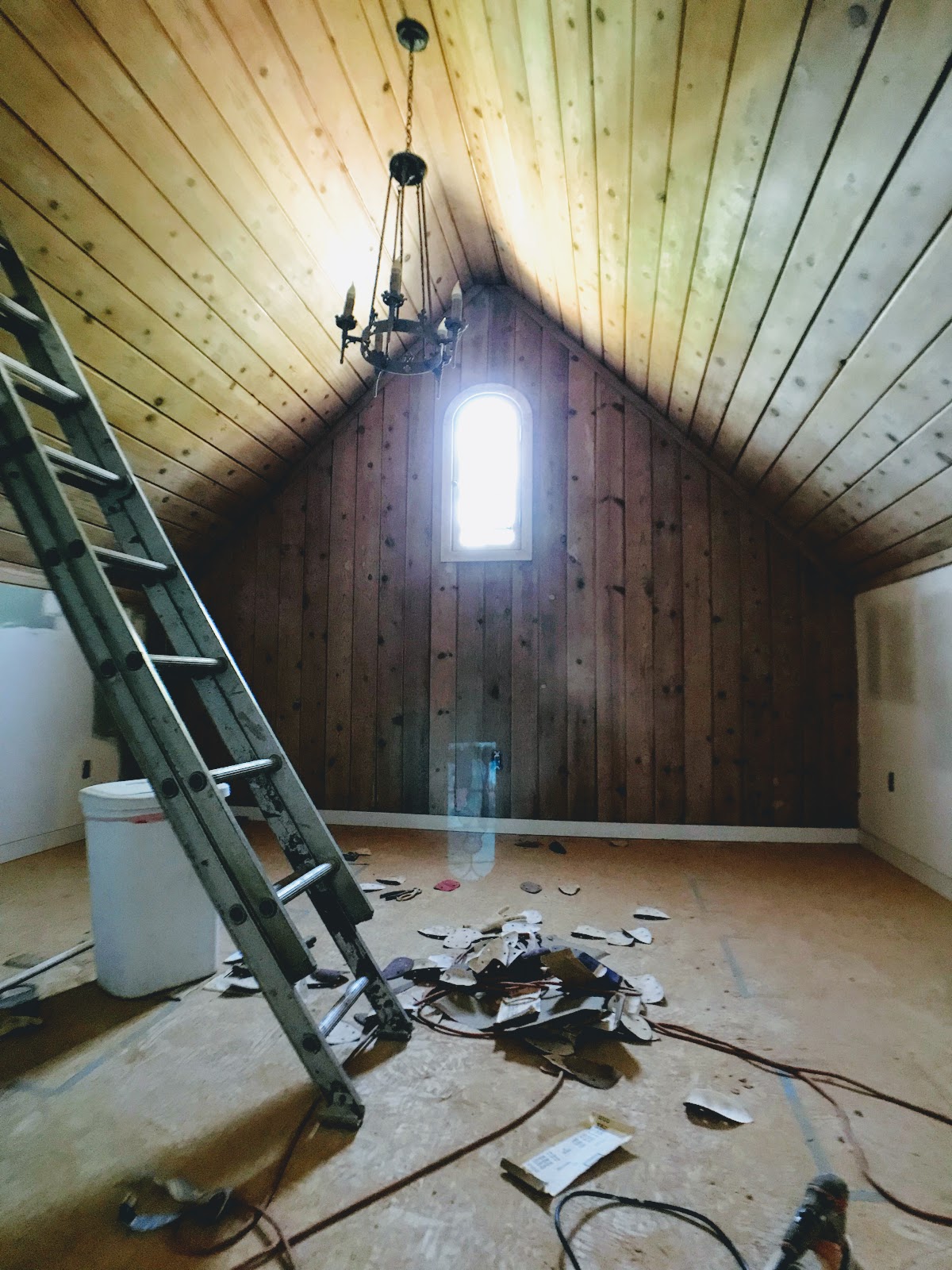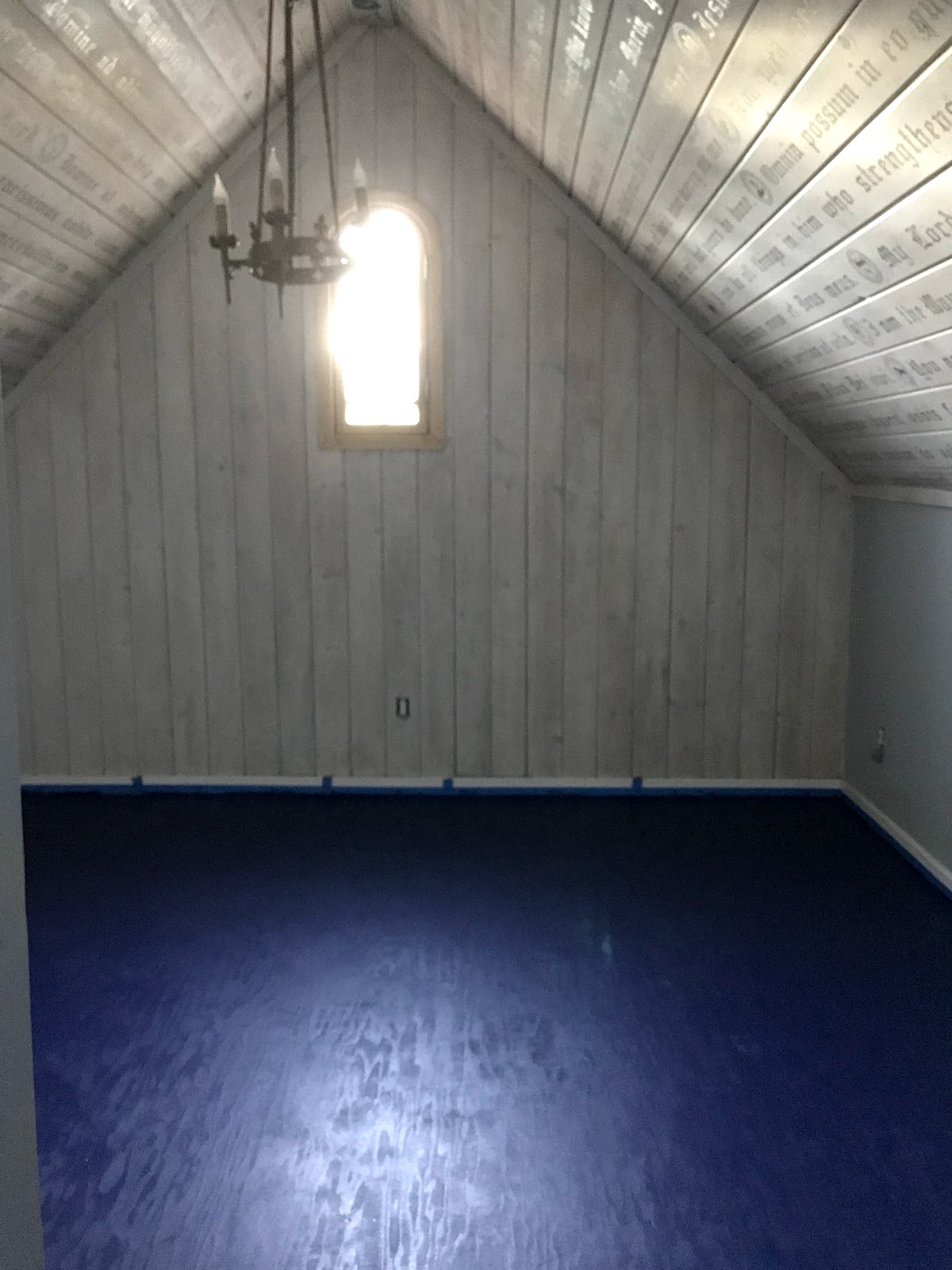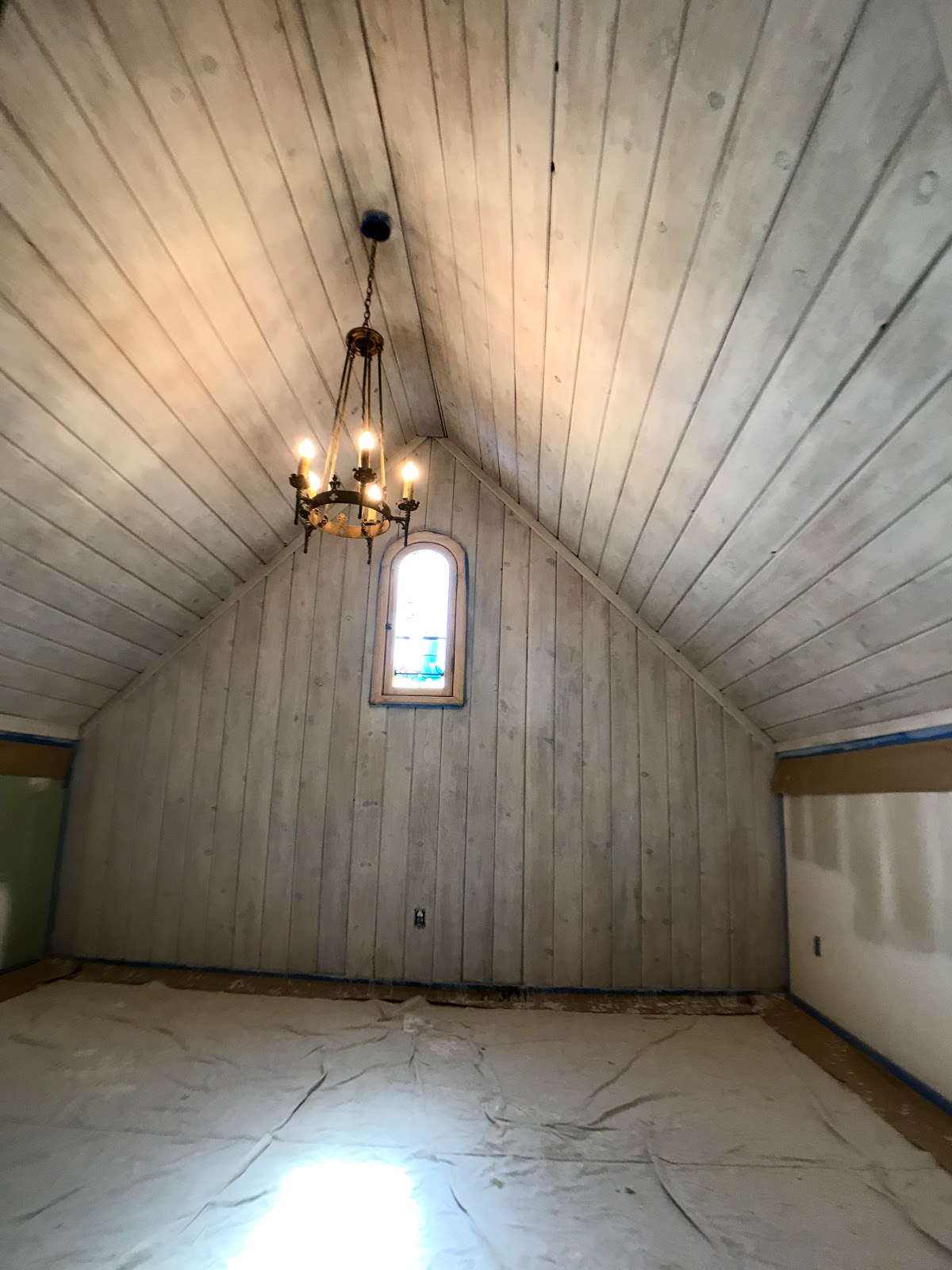 The chapel started out as an upstairs storage room off of what was the servant’s quarters in our 1920-built home. It had shiplap. And a chin up bar.