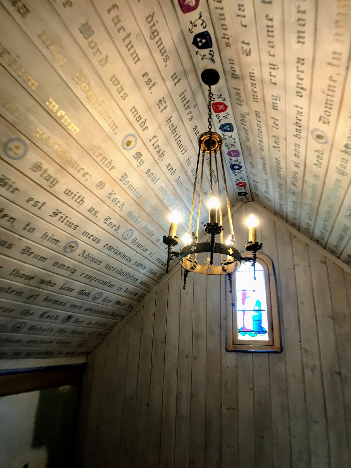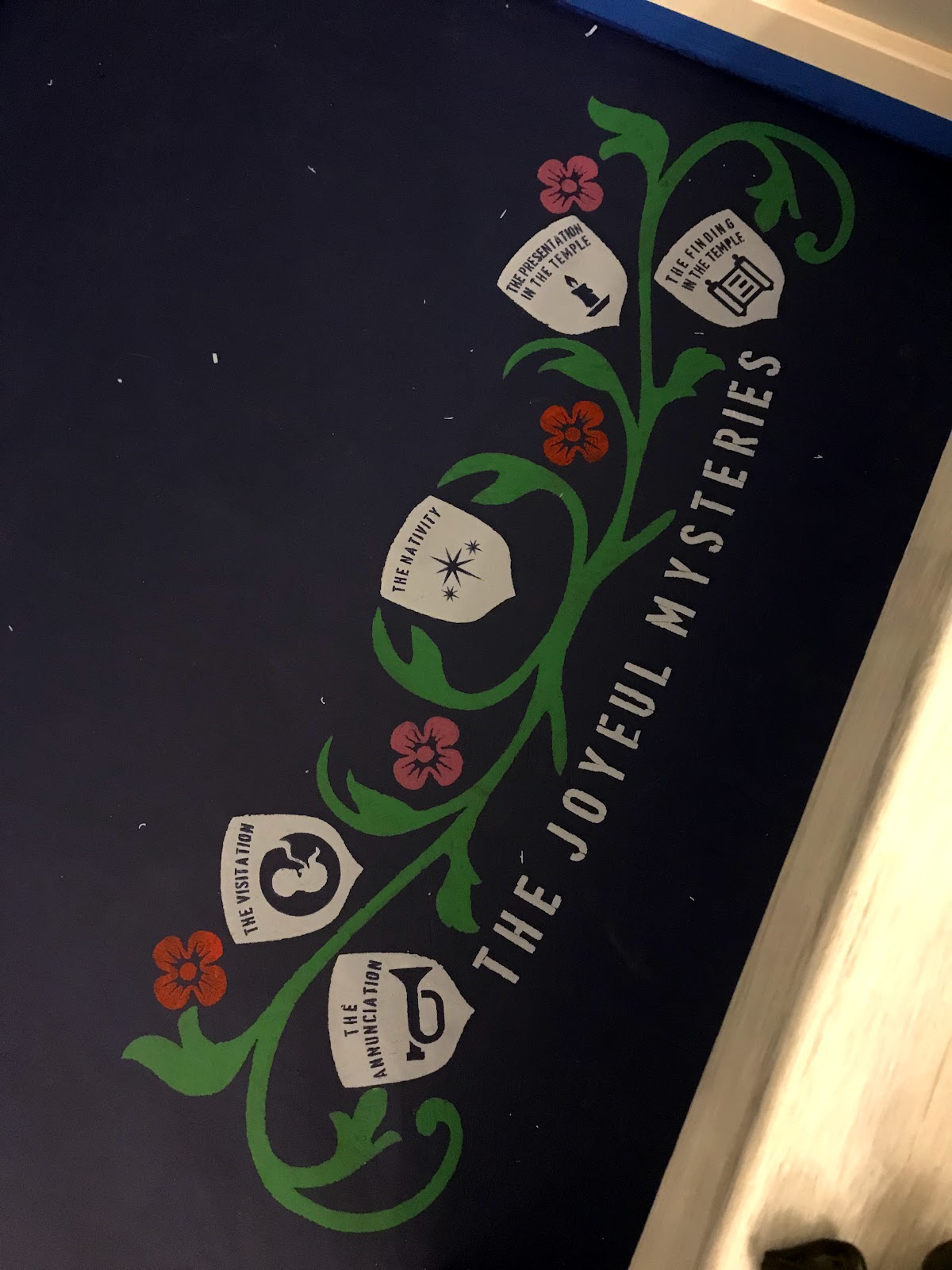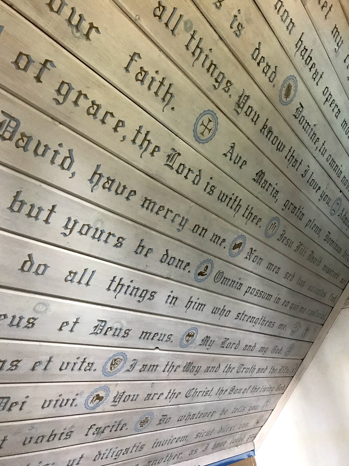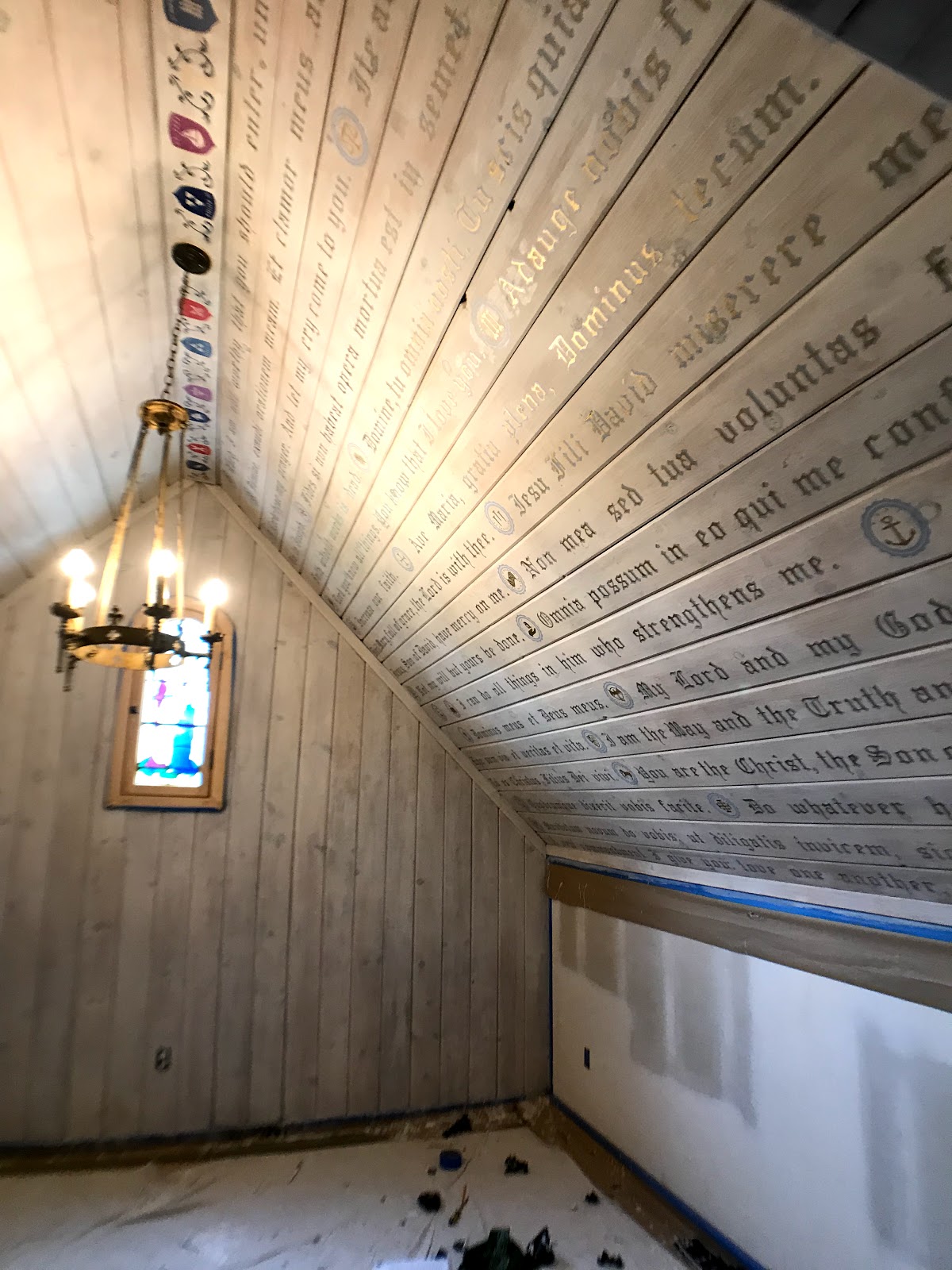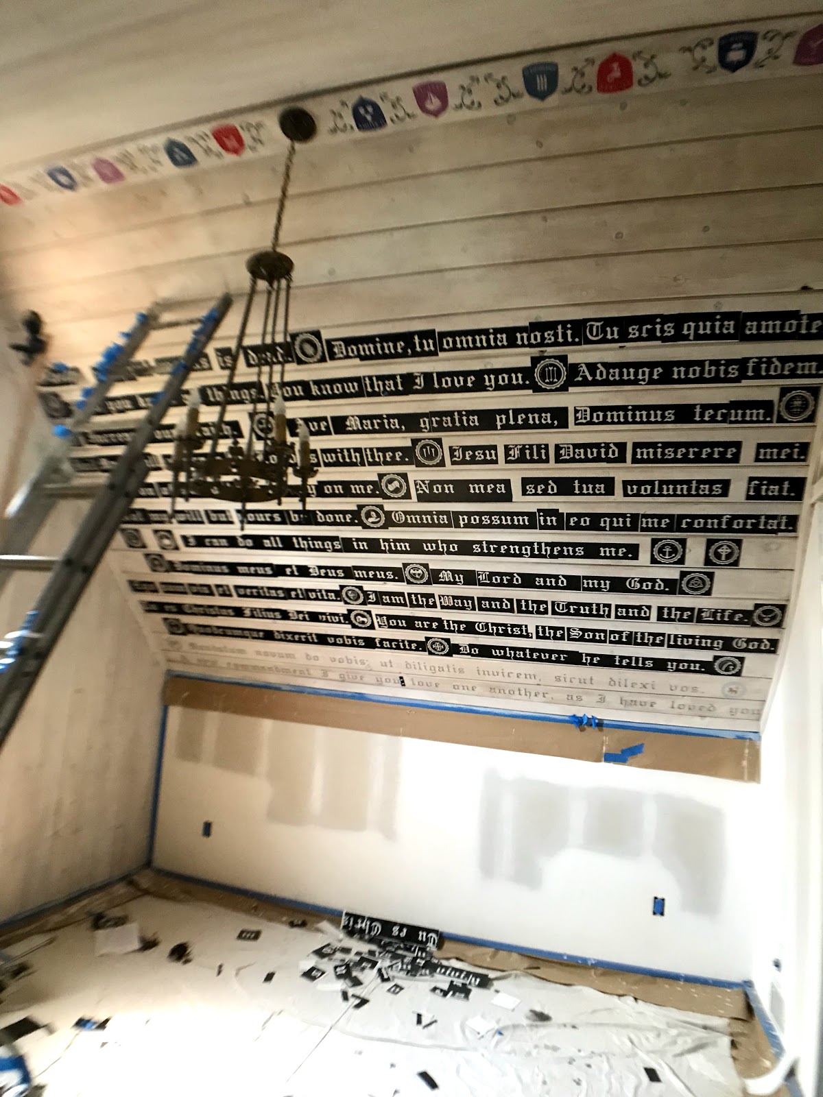 Next up was the ceiling, which is covered in Bible quotes in English and Latin, and small medallions featuring saint and traditional Catholic symbols. You can see the vinyl stencils here.