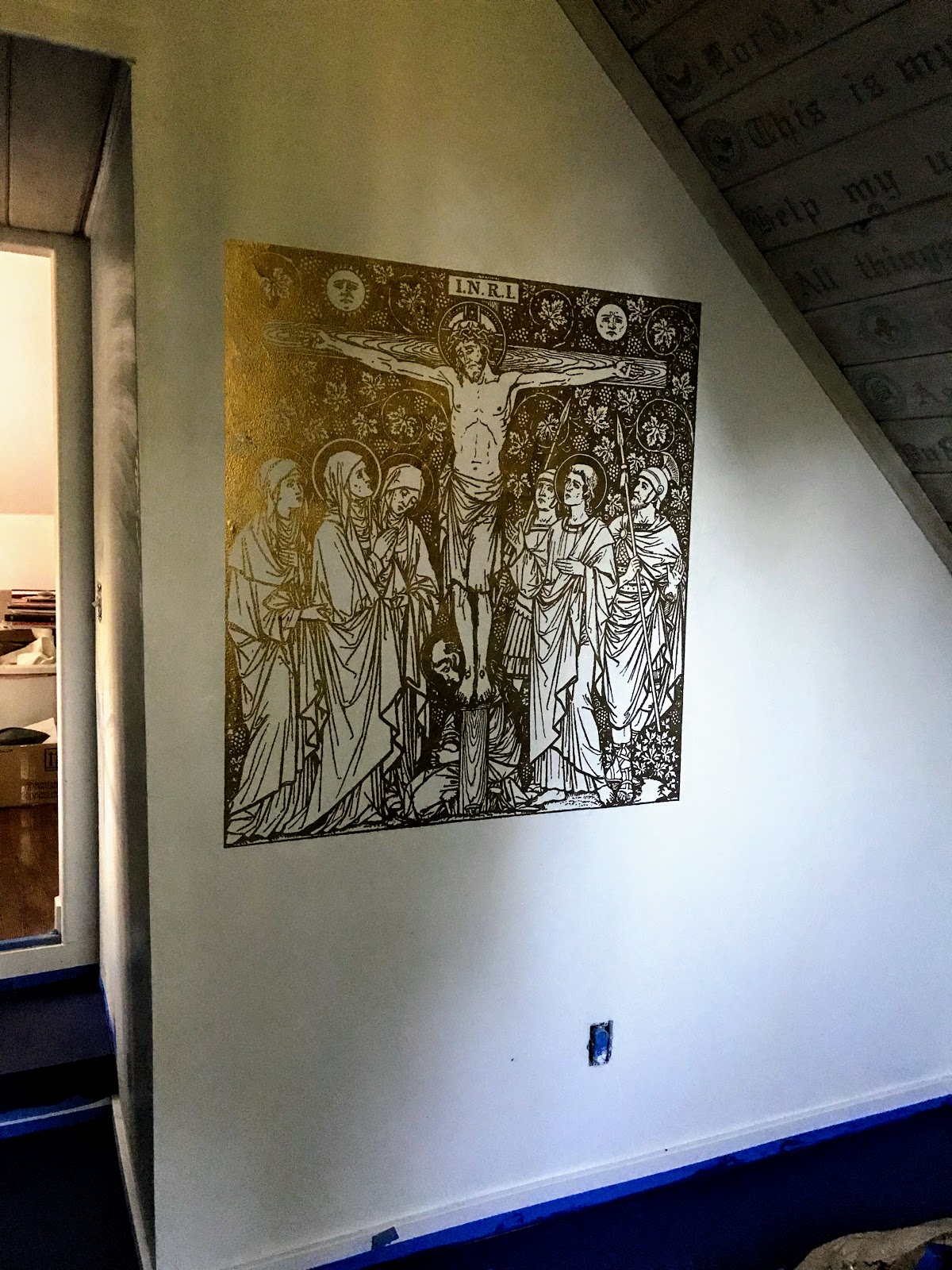 Next, I blew up this crucifixion scene from an 1899 Missale Romanum into an eight piece stencil for the back wall.